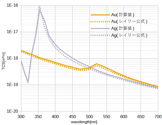 図2に金と銀の全散乱断面積の波長特性を示します。