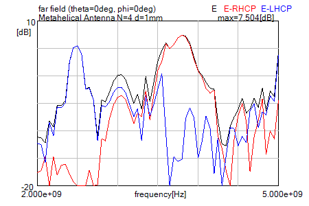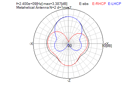 本アンテナは低い周波数で左旋円偏波、高い周波数で右旋円偏波を放射します。