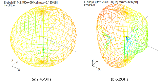図3に2.45GHzと5.2GHzにおける全方向の放射パターンを示します。