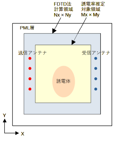 誘電体を含む対象領域を考え、その外部に送信アンテナと受信アンテナを置きます。