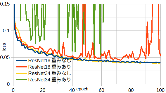 以下では、性能がよく計算時間も短いResNet18重みなしを使用します。