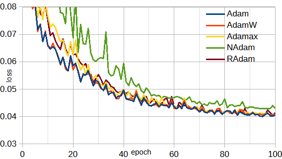 図からNAdam以外はほとんど同じです。以下では、Adamを使用します。