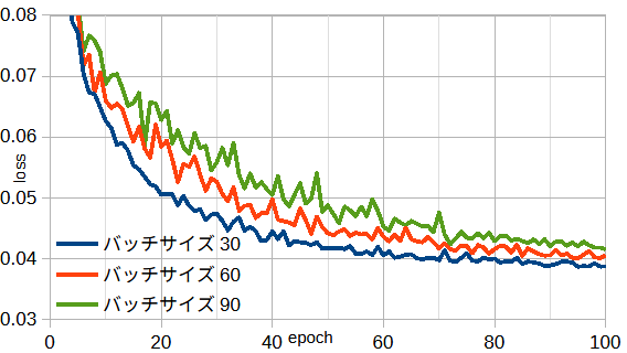 エポックあたりの計算時間はバッチサイズ=30/60/90のとき7.2/3.6/3.3秒です。