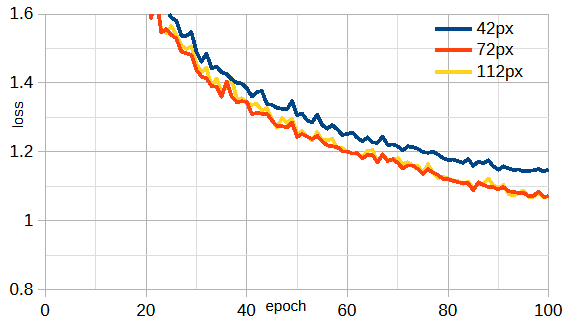 1エポック当たりの計算時間は画素数=42/72/112のとき3.5/4.0/6.2秒です。