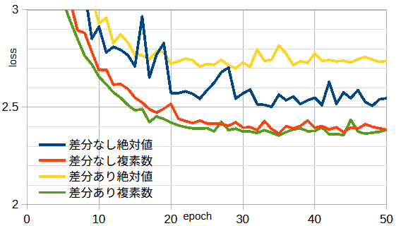 図から、複素数をとったとき損失が小さくなりますが、差分の影響は小さいことがわかります。