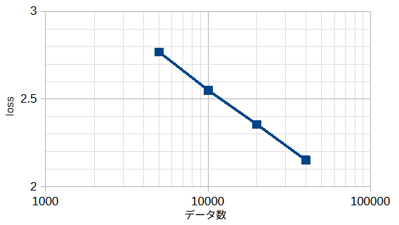 データ数が多いほど損失が小さくなることがわかります(スケーリング則)。